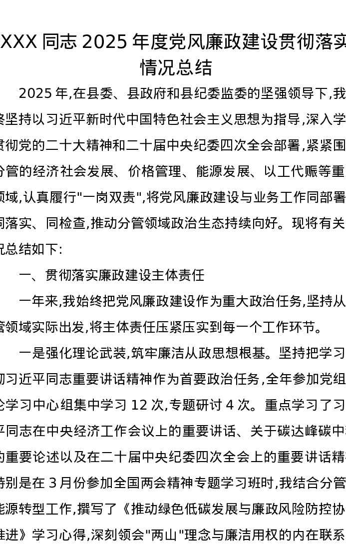 XXX同志2025年度党风廉政建设贯彻落实情况总结
