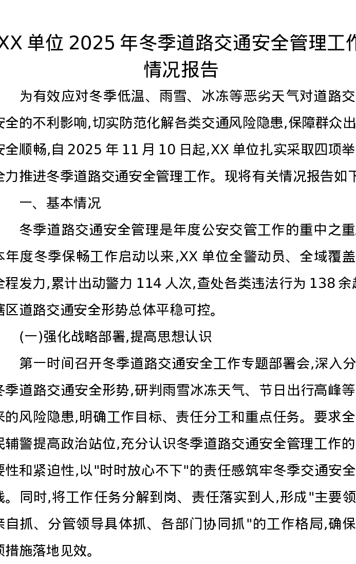 XX单位2025年冬季道路交通安全管理工作情况报告