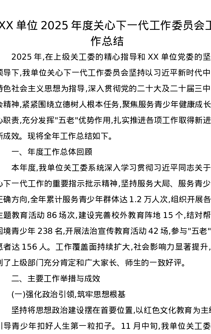 XX单位2025年度关心下一代工作委员会工作总结