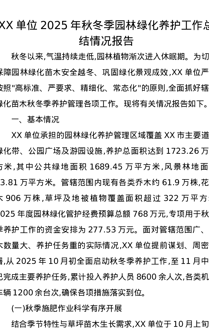 XX单位2025年秋冬季园林绿化养护工作总结情况报告