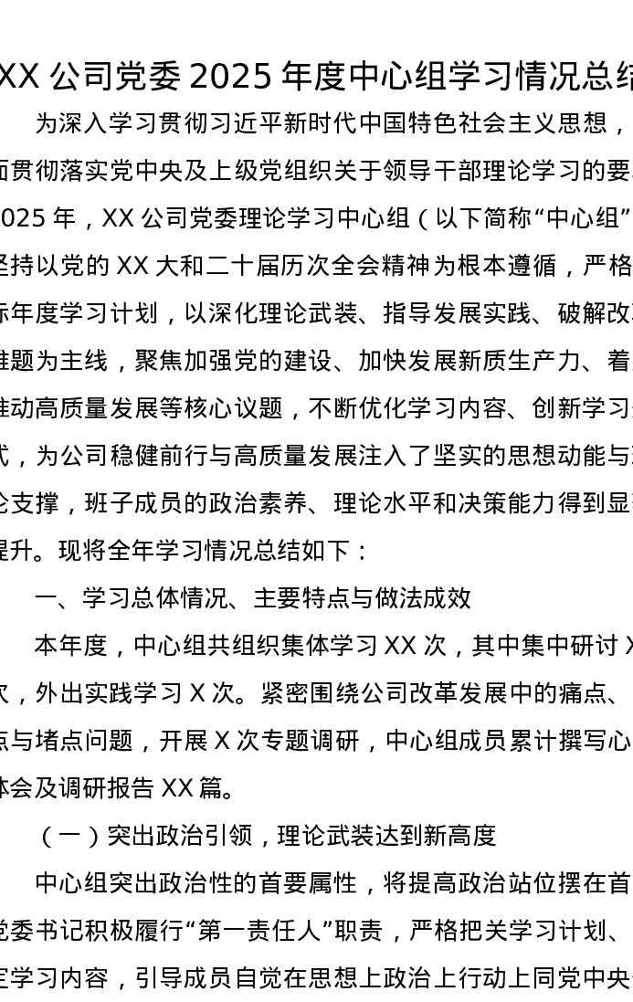 XX公司党委2025年度中心组学习情况总结