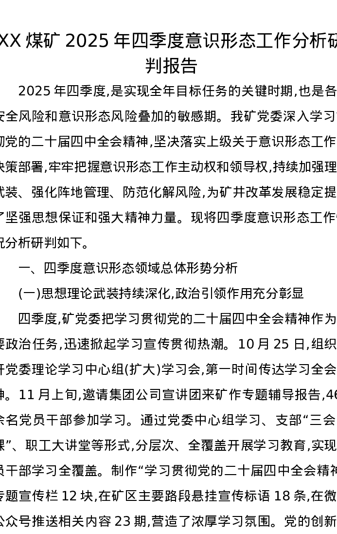 XX煤矿2025年四季度意识形态工作分析研判报告