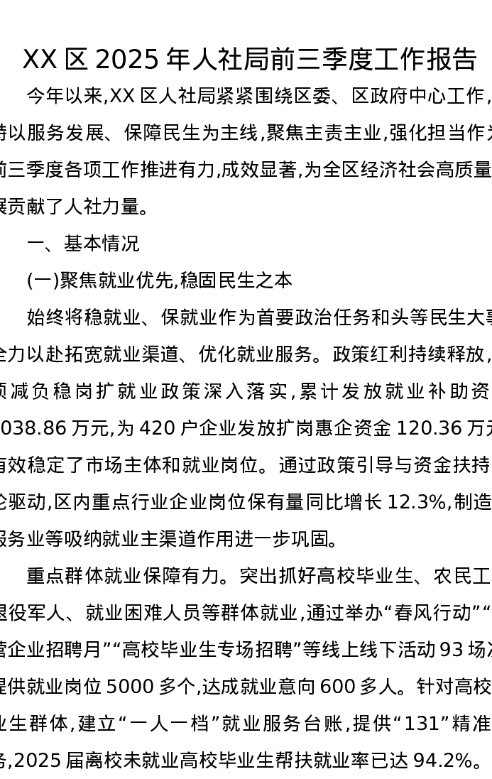 XX区2025年人社局前三季度工作报告