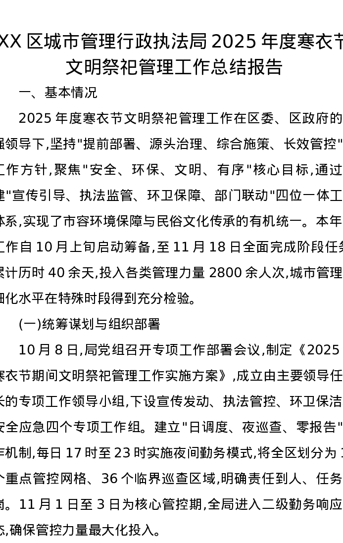 XX区城市管理行政执法局2025年度寒衣节文明祭祀管理工作总结报告