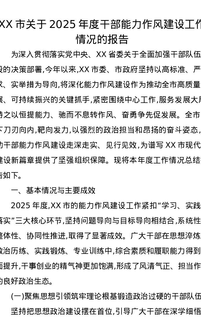 XX市关于2025年度干部能力作风建设工作情况的报告