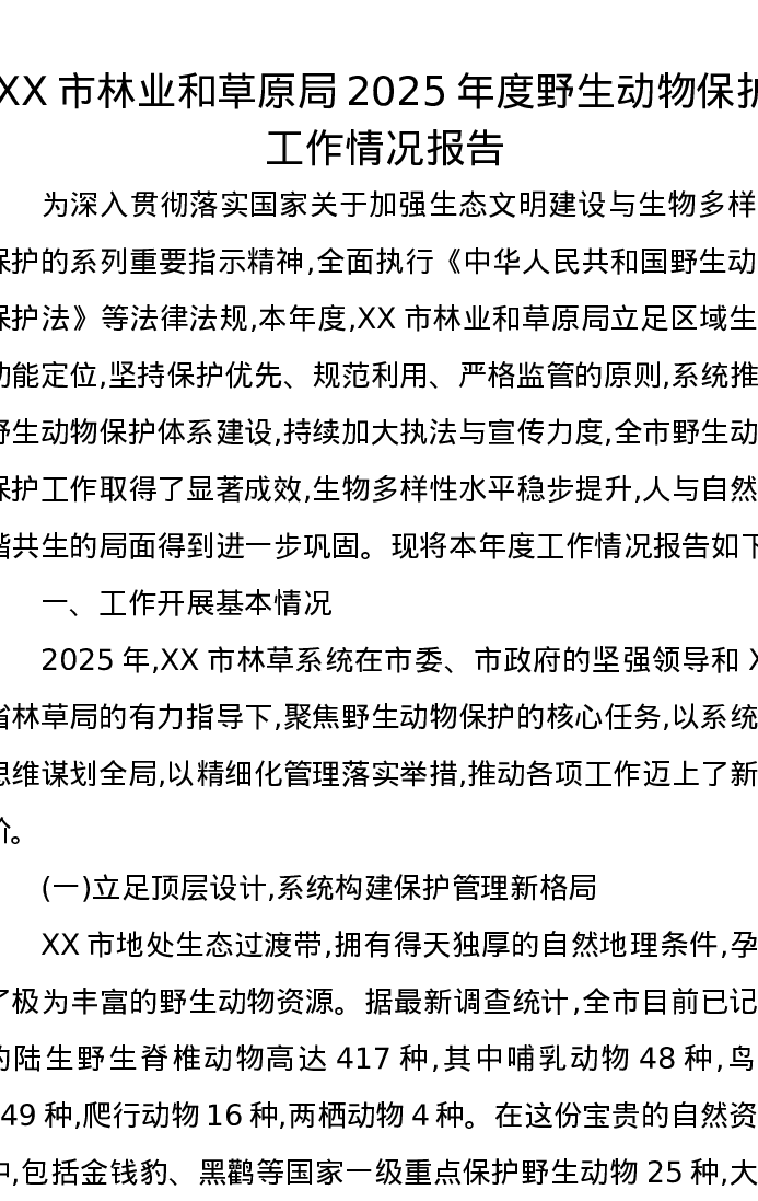 XX市林业和草原局2025年度野生动物保护工作情况报告
