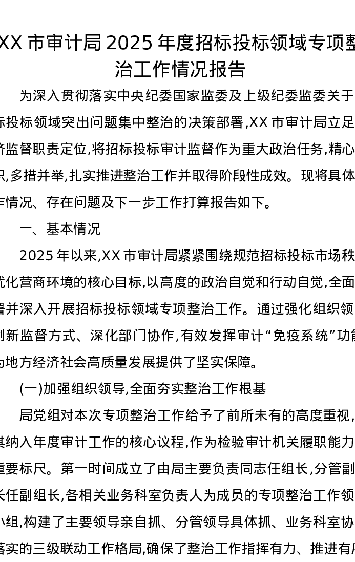 XX市审计局2025年度招标投标领域专项整治工作情况报告