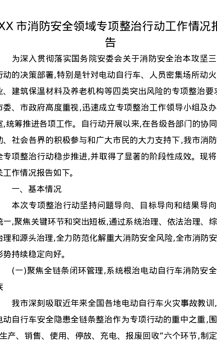 XX市消防安全领域专项整治行动工作情况报告
