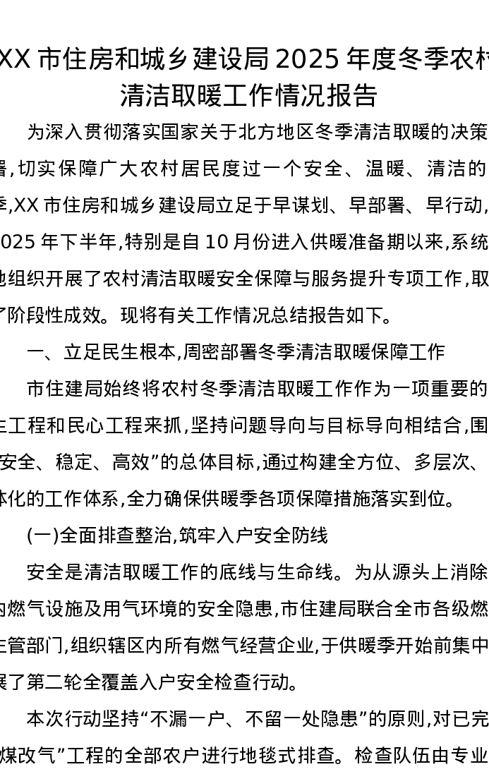 XX市住房和城乡建设局2025年度冬季农村清洁取暖工作情况报告