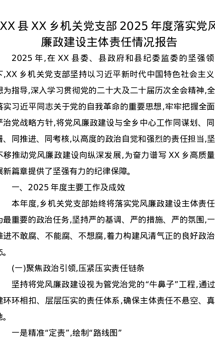 XX县XX乡机关党支部2025年度落实党风廉政建设主体责任情况报告