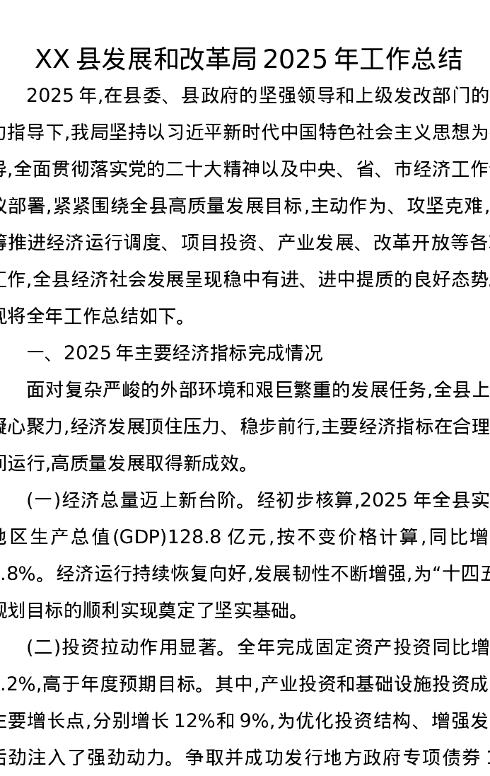 XX县发展和改革局2025年工作总结