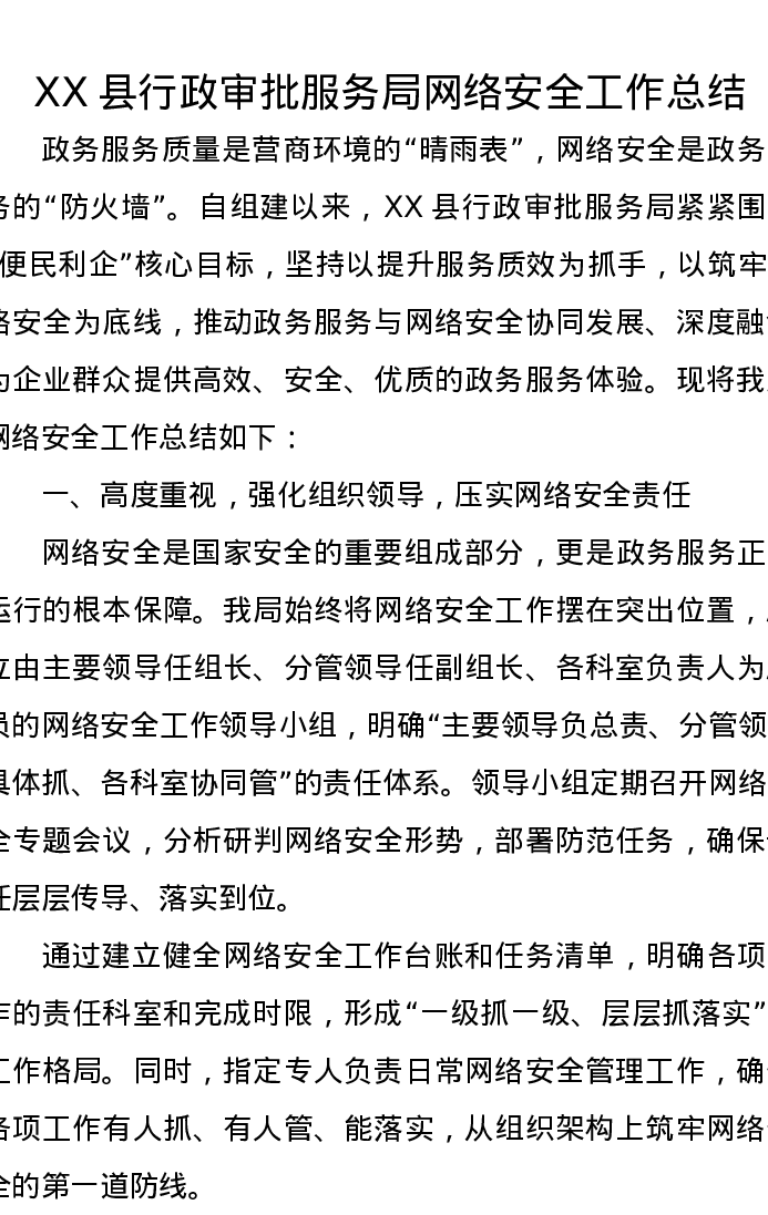 XX县行政审批服务局网络安全工作总结