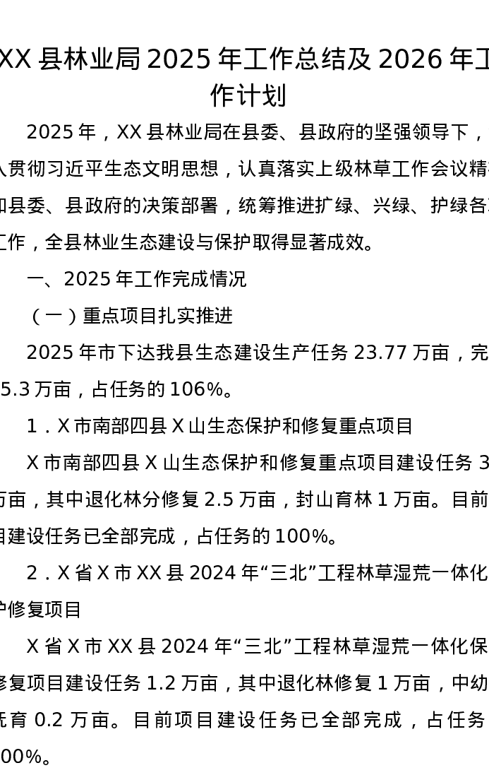 XX县林业局2025年工作总结及2026年工作计划