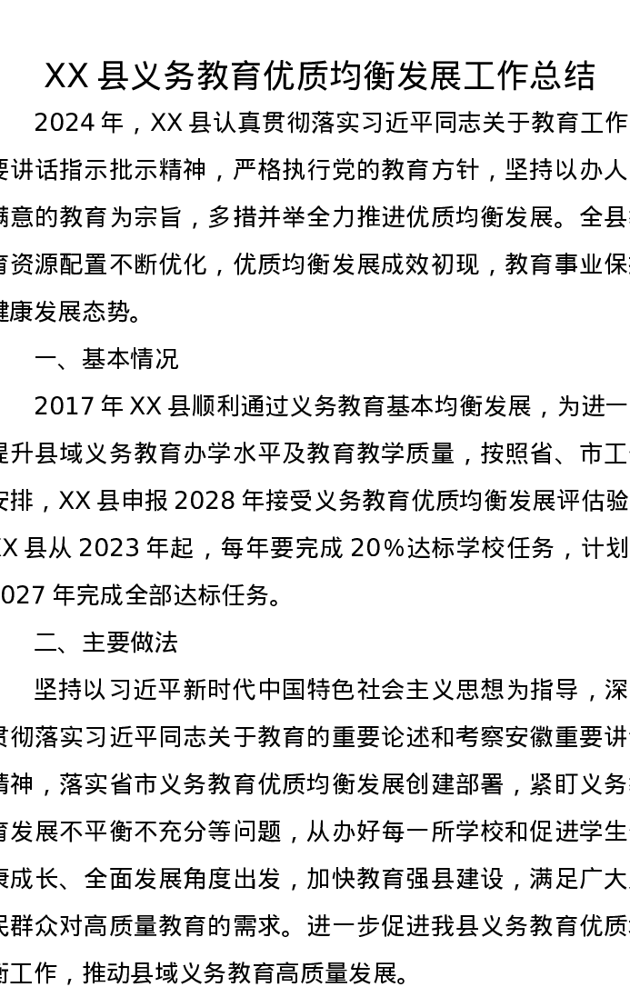 XX县义务教育优质均衡发展工作总结