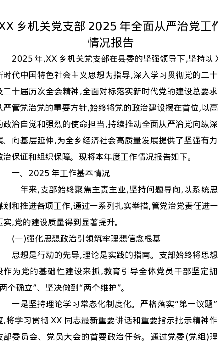 XX乡机关党支部2025年全面从严治党工作情况报告