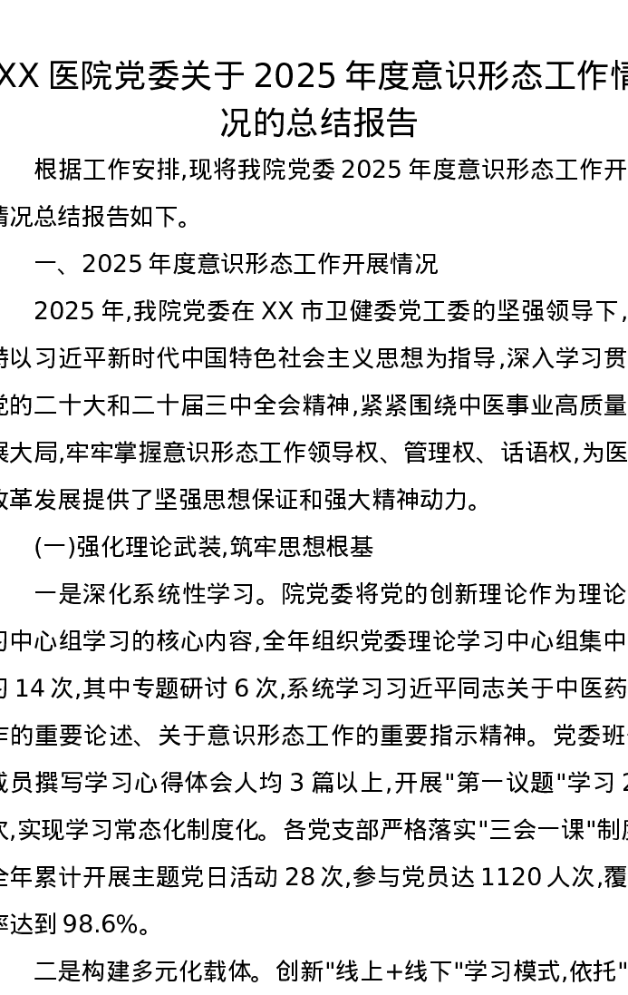 XX医院党委关于2025年度意识形态工作情况的总结报告
