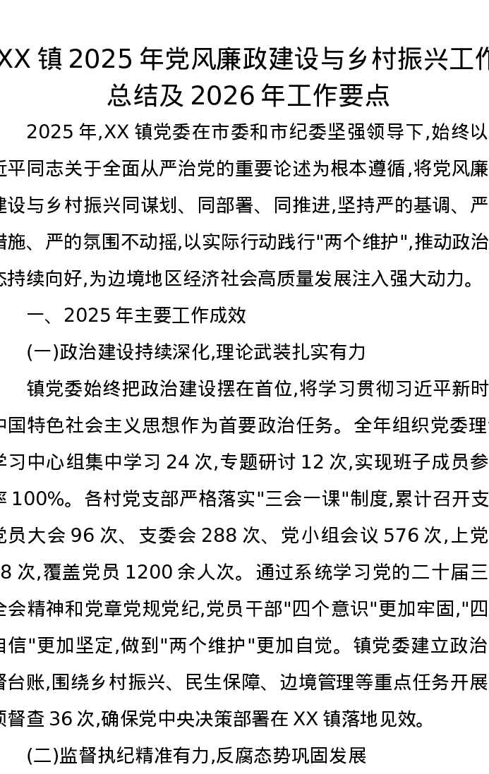 XX镇2025年党风廉政建设与乡村振兴工作总结及2026年工作要点