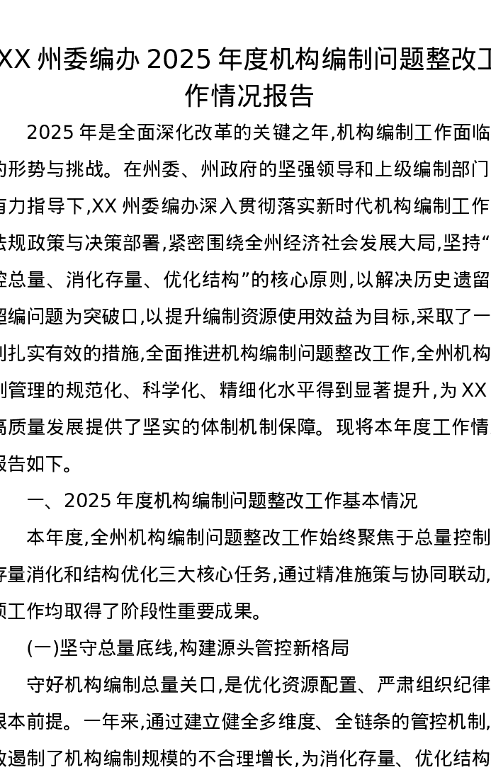 XX州委编办2025年度机构编制问题整改工作情况报告