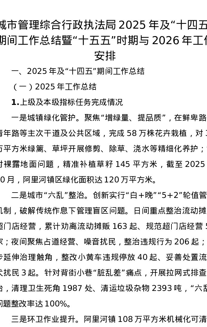 城市管理综合行政执法局2025年及“十四五”期间工作总结暨“十五五”时期与2026年工作安排