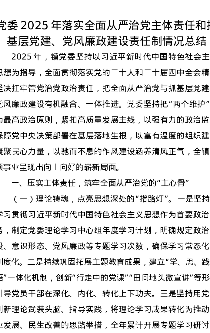 党委2025年落实全面从严治党主体责任和抓基层党建、党风廉政建设责任制情况总结