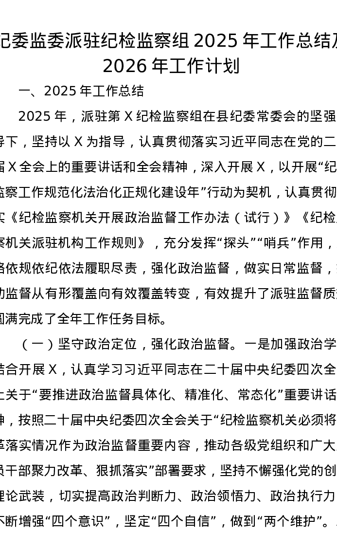 纪委监委派驻纪检监察组2025年工作总结及2026年工作计划