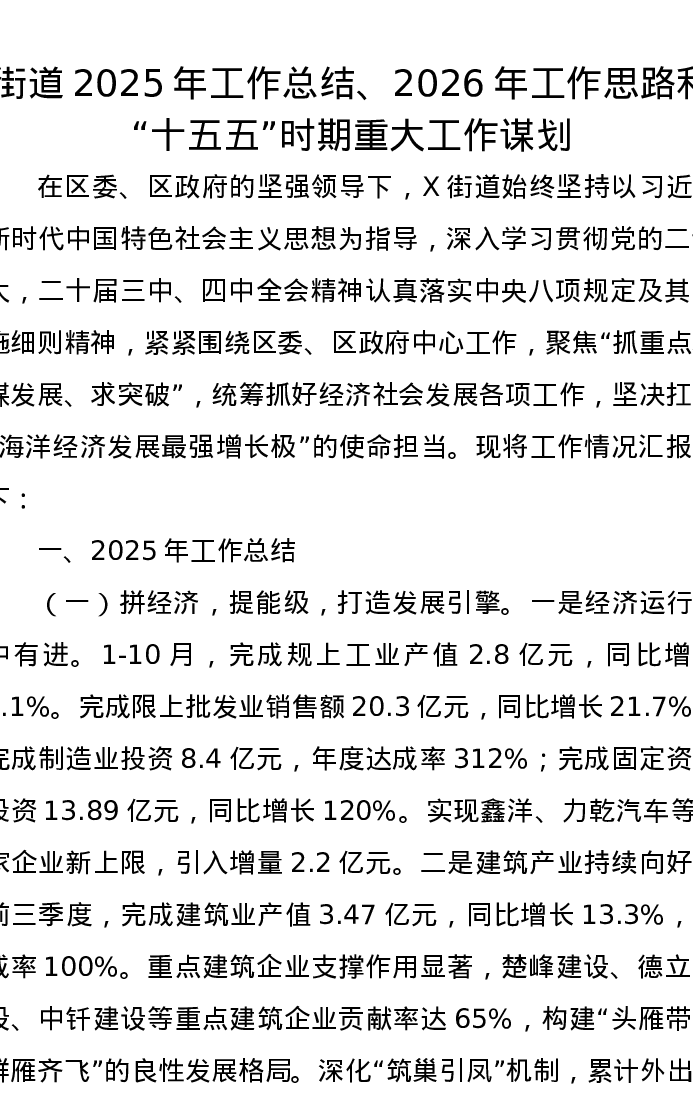 街道2025年工作总结、2026年工作思路和“十五五”时期重大工作谋划