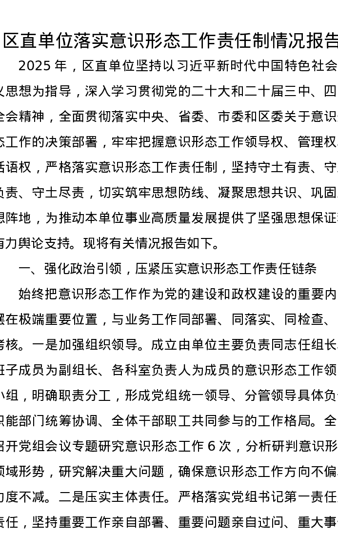 区直单位落实意识形态工作责任制情况报告