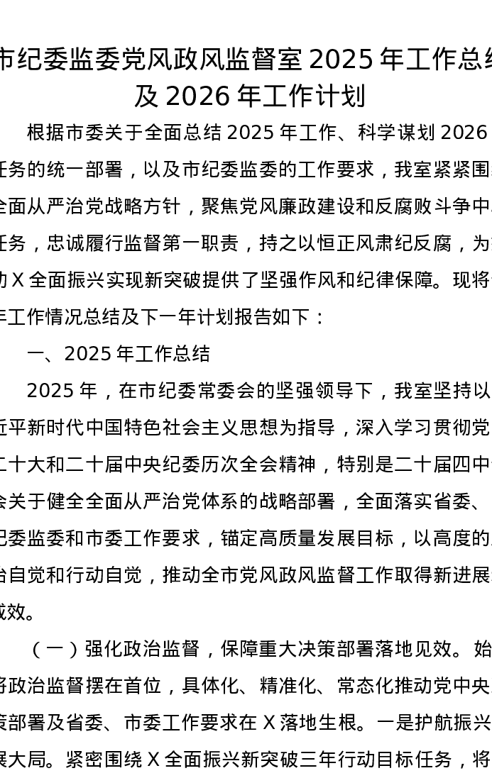 市纪委监委党风政风监督室2025年工作总结及2026年工作计划
