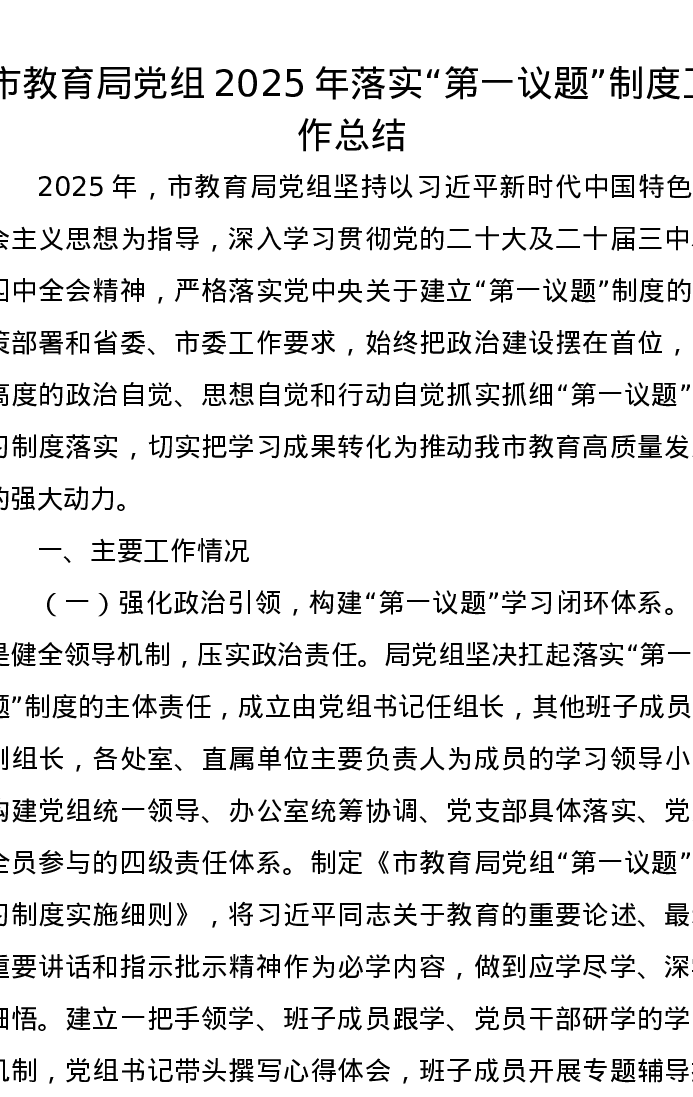 市教育局党组2025年落实“第一议题”制度工作总结