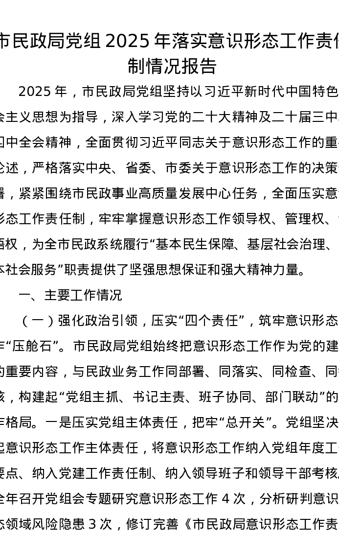 市民政局党组2025年落实意识形态工作责任制情况报告