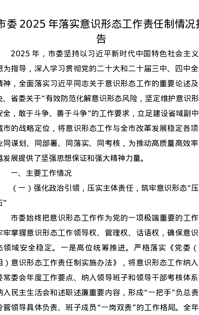 市委2025年落实意识形态工作责任制情况报告