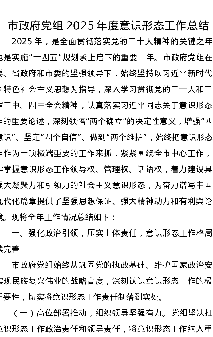 市政府党组2025年度意识形态工作总结