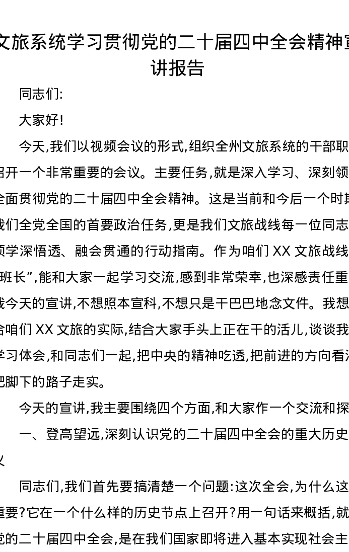 文旅系统学习贯彻党的二十届四中全会精神宣讲报告讲稿