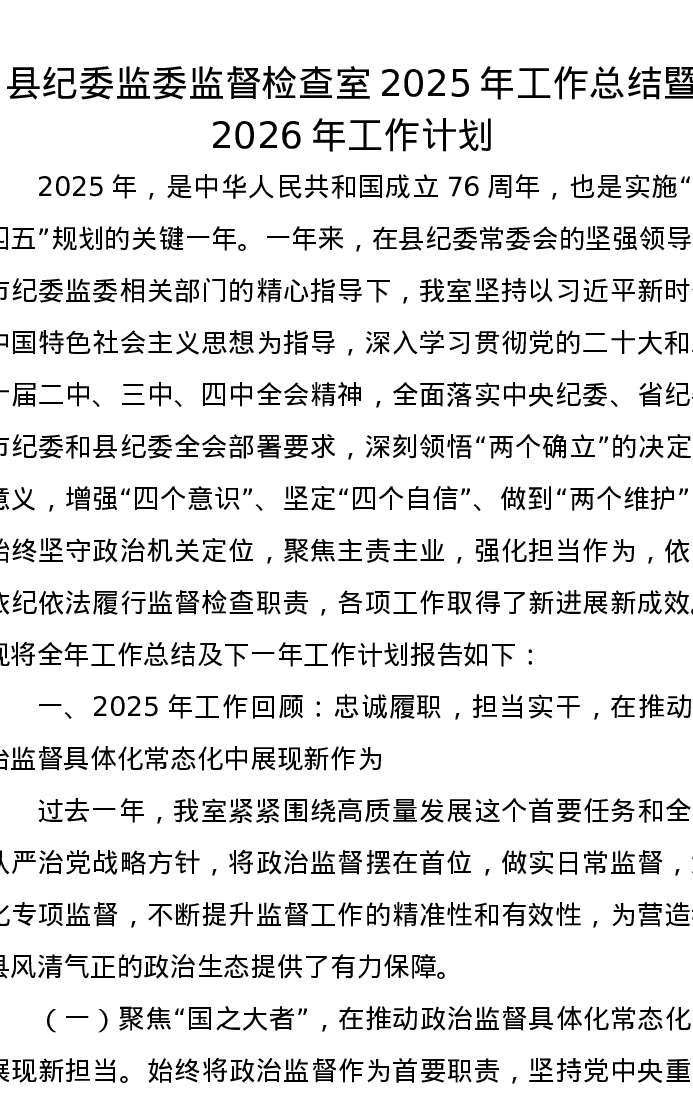 县纪委监委监督检查室2025年工作总结暨2026年工作计划