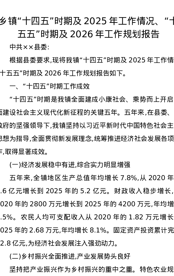 乡镇“十四五”时期及2025年工作情况、“十五五”时期及2026年工作规划报告