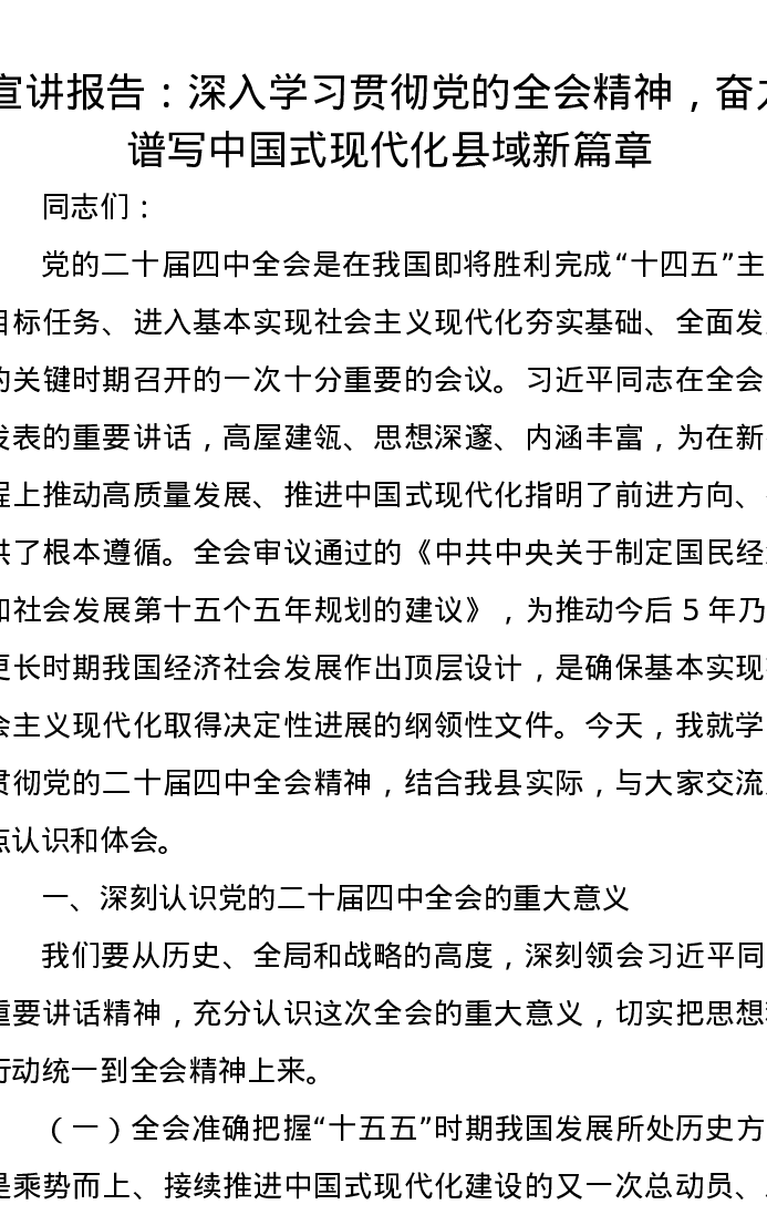 宣讲报告:深入学习贯彻党的二十届四中全会精神,奋力谱写中国式现代化县域新篇章