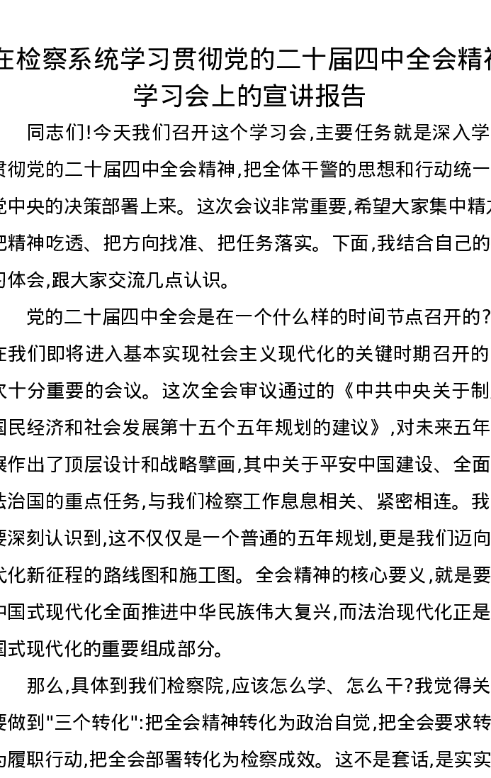 在检察系统学习贯彻党的二十届四中全会精神学习会上的宣讲报告