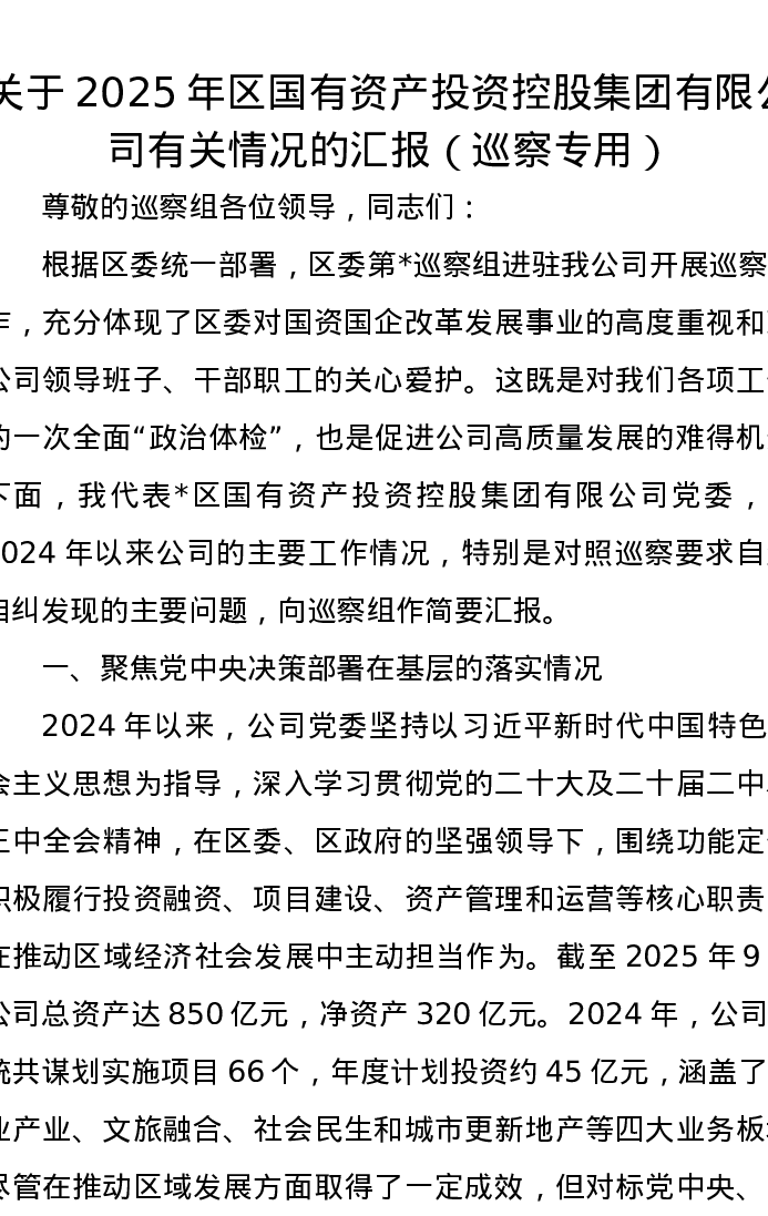 关于2025年区国有资产投资控股集团有限公司有关情况的汇报(巡察专用)