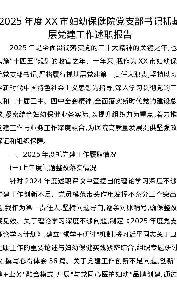2025年度XX市妇幼保健院党支部书记抓基层党建工作述职报告