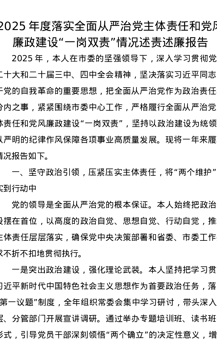 2025年度落实全面从严治党主体责任和党风廉政建设“一岗双责”情况述责述廉报告
