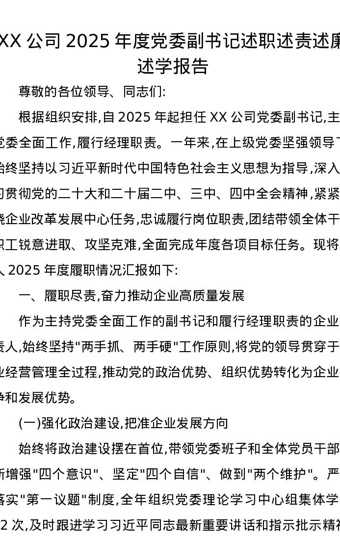 XX公司2025年度党委副书记述职述责述廉述学报告