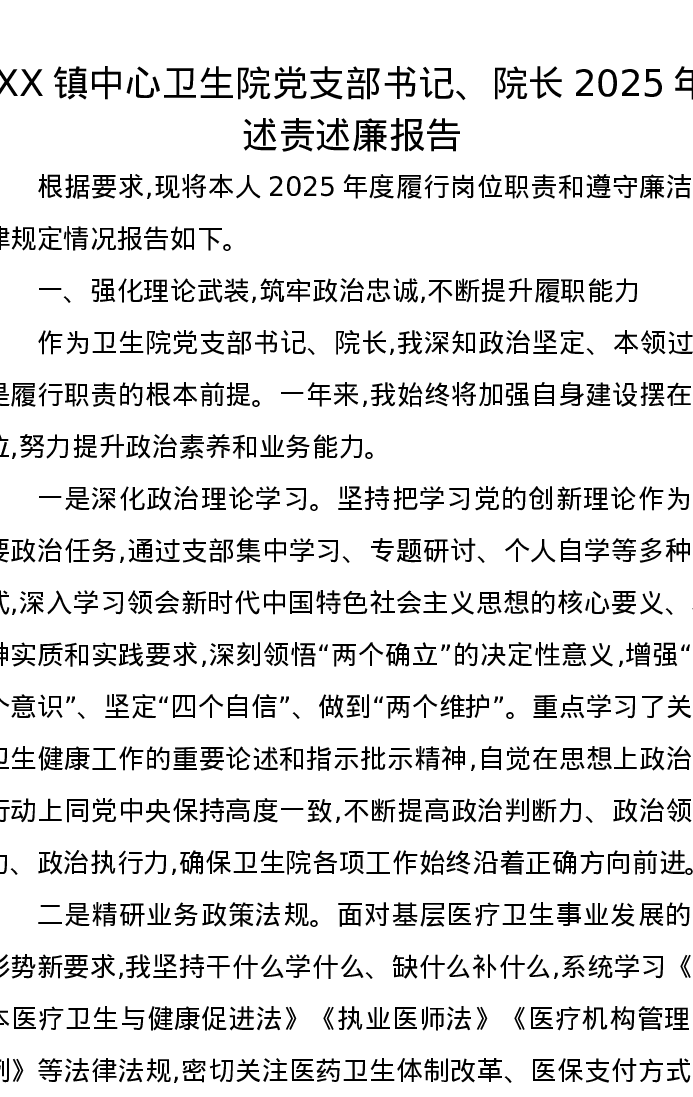 XX镇中心卫生院党支部书记、院长2025年述责述廉报告