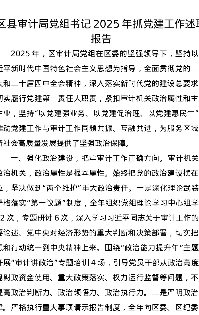 区县审计局党组书记2025年抓党建工作述职报告