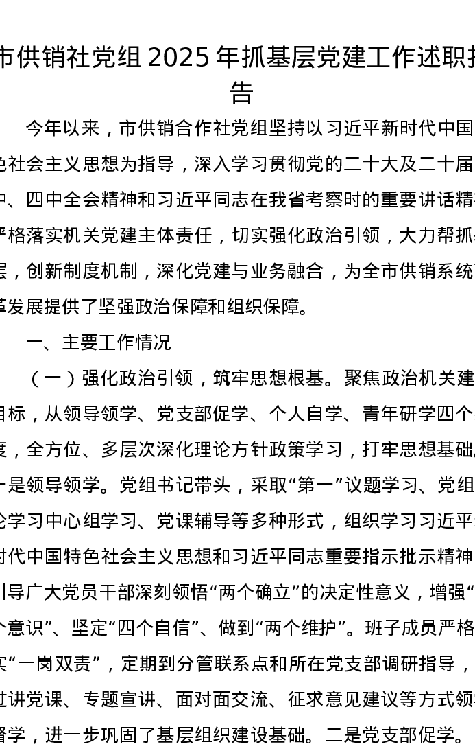 市供销社党组2025年抓基层党建工作述职报告
