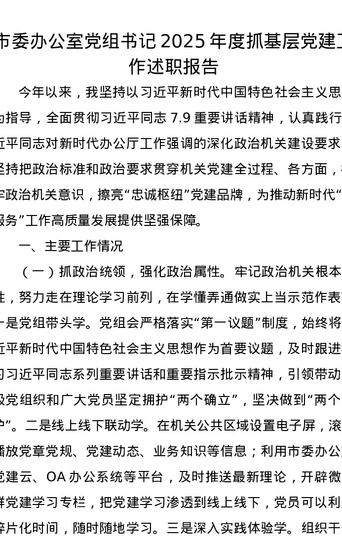 市委办公室党组书记2025年度抓基层党建工作述职报告