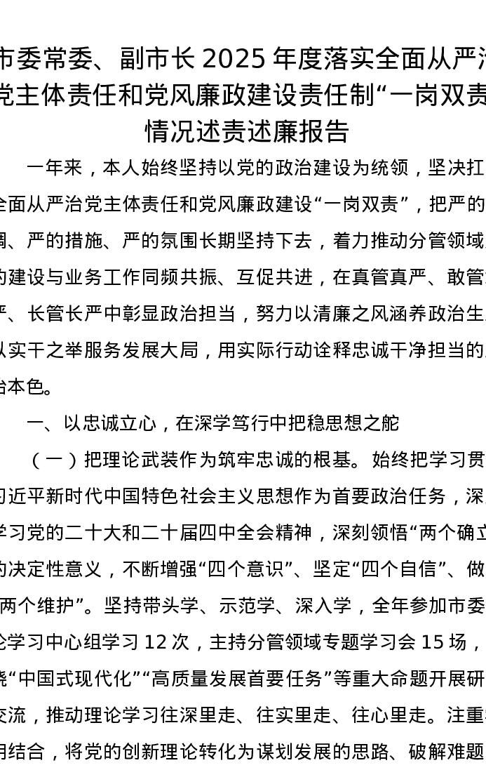 市委常委、副市长2025年度落实全面从严治党主体责任和党风廉政建设责任制“一岗双责”情况述责述廉报告