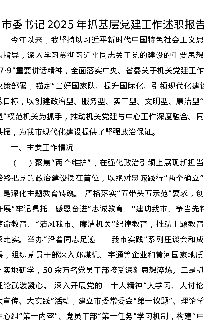 市委书记2025年抓基层党建工作述职报告