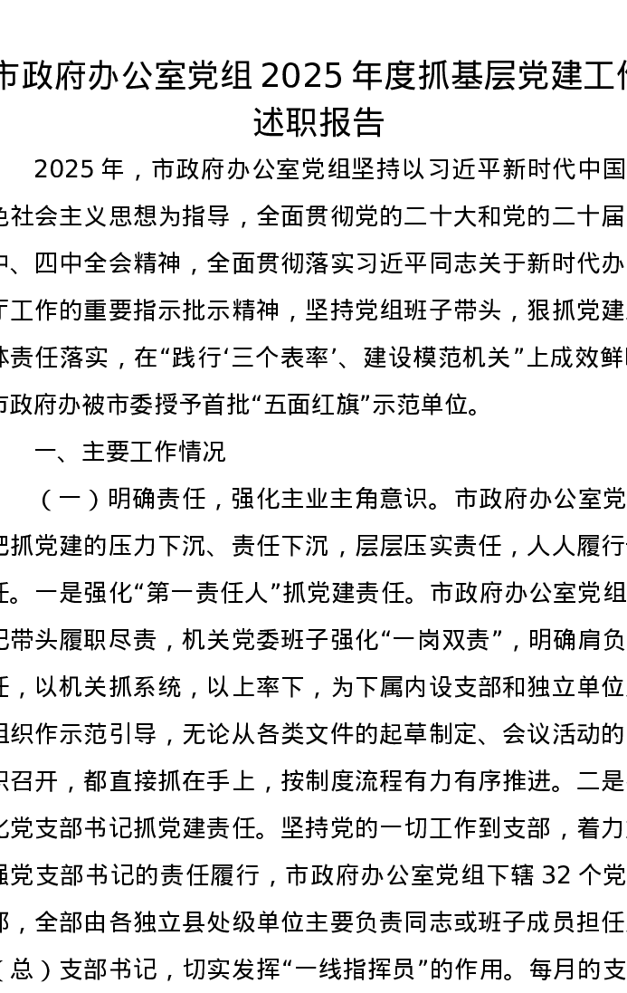 市政府办公室党组2025年度抓基层党建工作述职报告