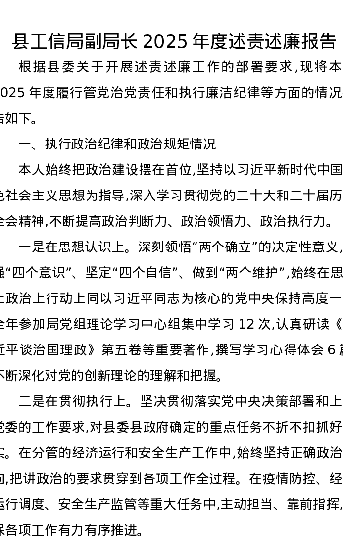县工信局副局长2025年度述责述廉报告