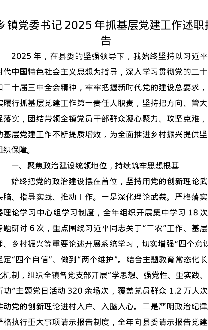 乡镇党委书记2025年抓基层党建工作述职报告